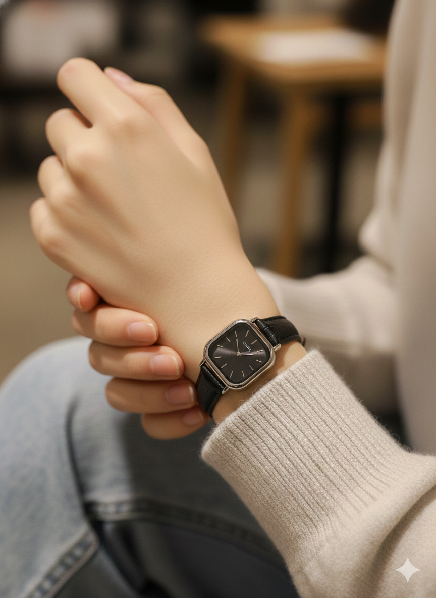 ساعت فلورا با بند چرمی مشکی ترکیبی از سادگی و ظرافت است؛ انتخابی ایده‌آل و هوشمندانه برای کسانی که به استایل کلاسیک، مینیمال و ظریف علاقه دارند. بند چرمی مشکی با کیفیت، در کنار طراحی متعادل صفحه مربع شکل، این ساعت را به گزینه‌ای مناسب برای استفاده روزمره و موقعیت‌های رسمی تبدیل کرده است. فلورا با طراحی ظریف و رنگ‌بندی هماهنگ، به‌راحتی با انواع استایل‌ها ست می‌شود و جلوه‌ای شیک و ماندگار به استایل شما می‌بخشد.